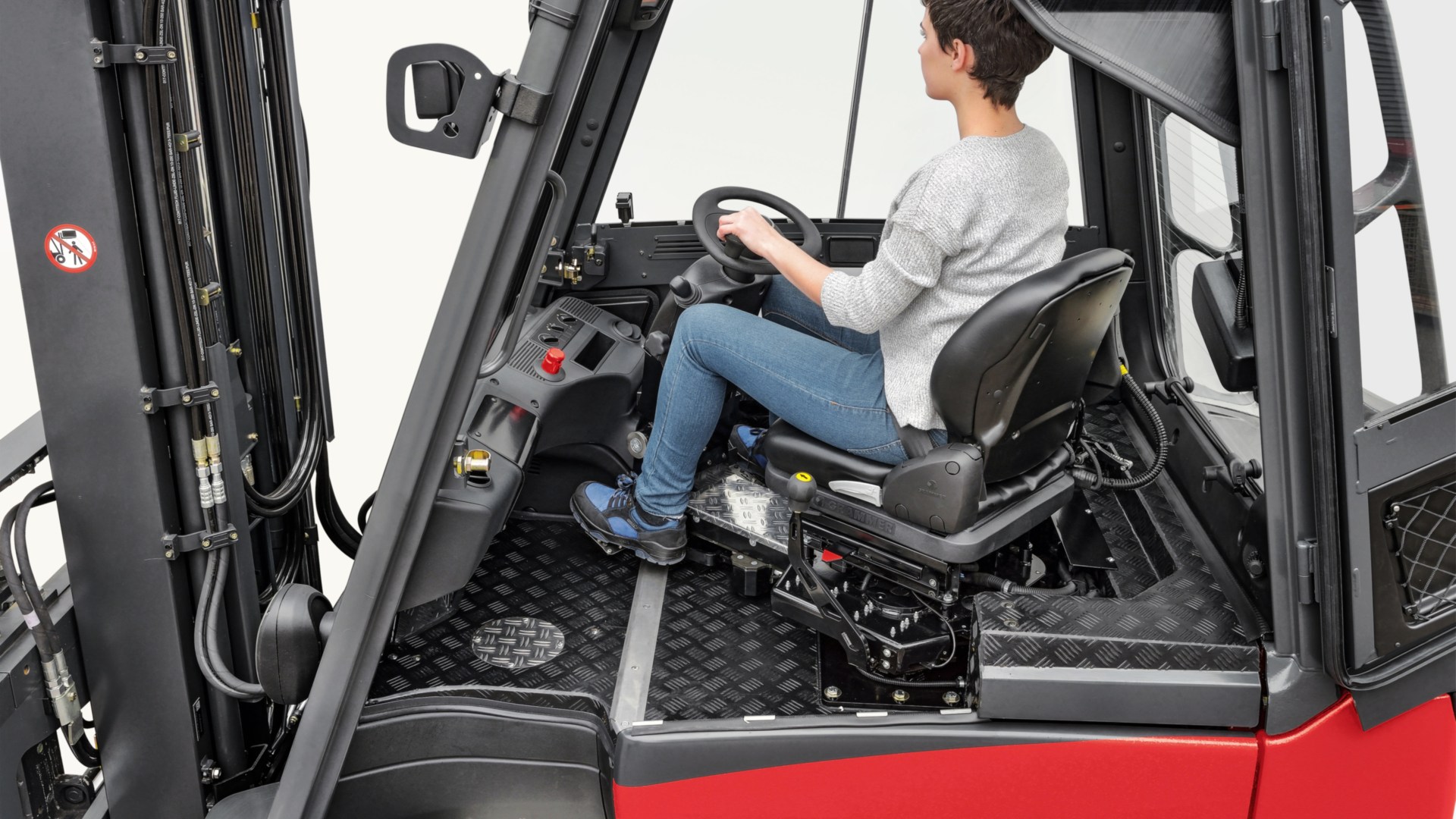 Оптимизированное рабочее место и удобная рукоятка управления обеспечивают легкость эксплуатации, вплоть до возможности управления одной рукой. При перемещении по любой траектории, водитель может располагаться под углом в 45 градусов (к продольной оси погрузчика) и это нисколько не ухудшит обзорность.